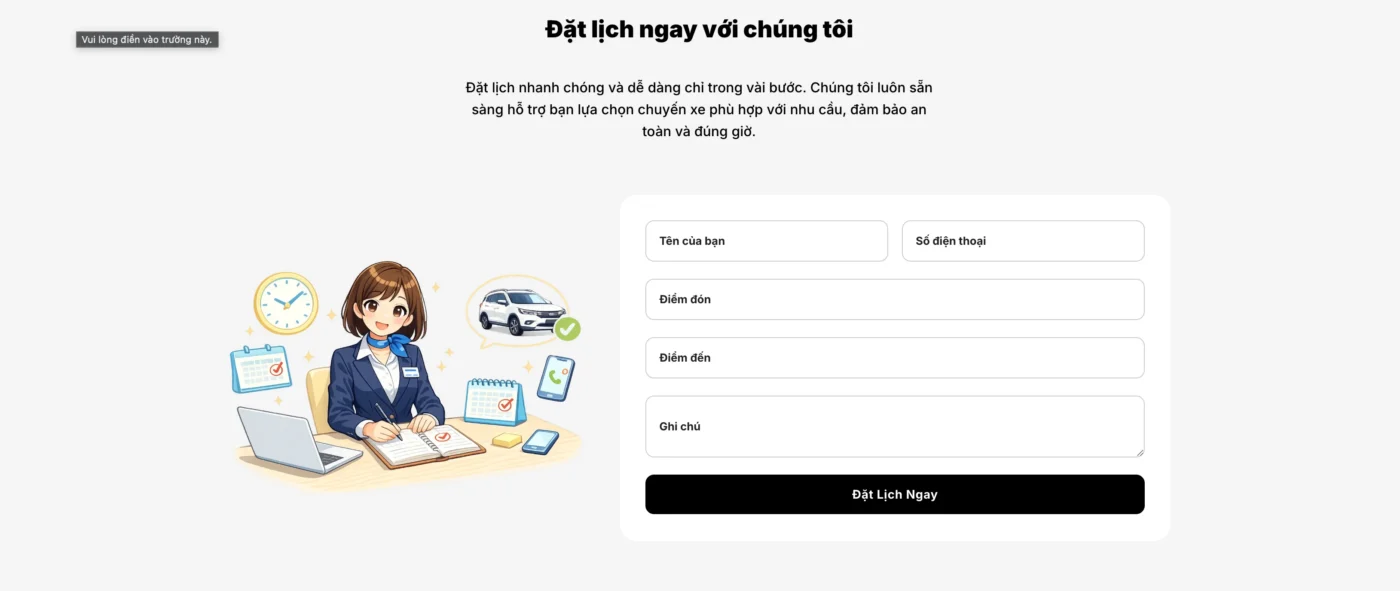 Form đặt xe được thiết kế rõ ràng giúp người dùng dễ dàng nhập thông tin cần thiết: